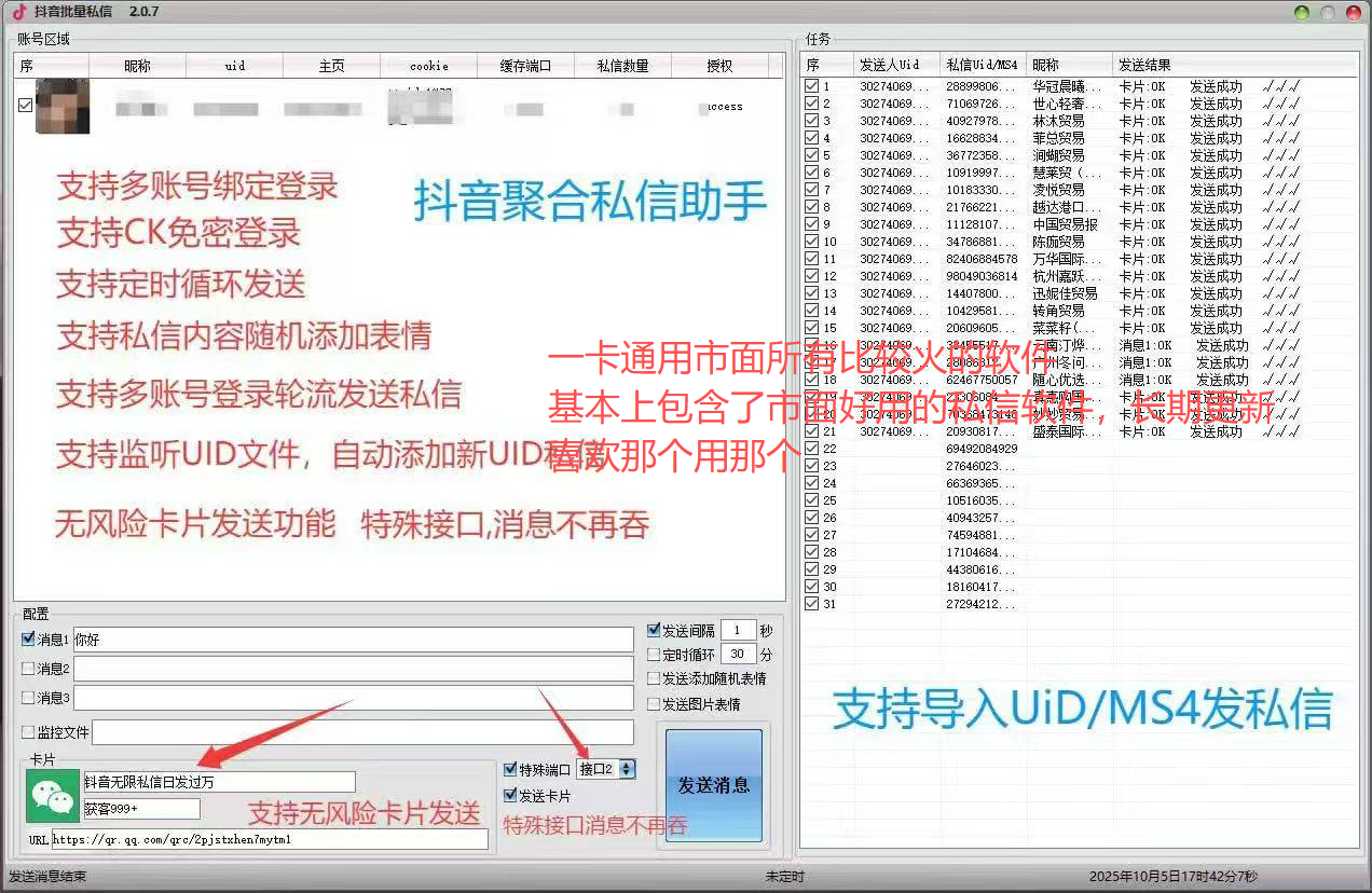 抖音批量私信工具-购买自动发下载地址和卡密----年卡